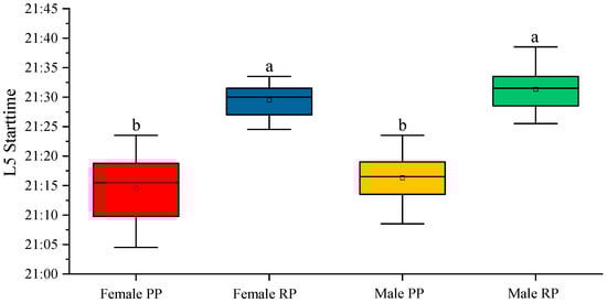 Regarding the start time of L5 during the pre-reproduction and reproduction periods, we found statistically significant differences between both males (p < 0.001) and females (p < 0.001). However, no significant differences of L5 were observed between males and females in the same period (Figure 7).