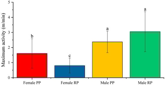 When comparing the sexes, the average maximal activity was statistically higher in males, both in the pre-reproductive (p < 0.05) and reproductive periods (p < 0.001), than it was in females (Figure 8).