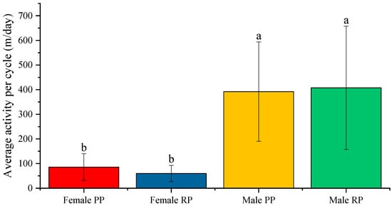 Regarding the average value of activity per cycle (m), no statistically significant differences were observed between males during the pre-reproductive (392.125 ± 36.833 m) and reproductive periods (407.662 ± 45.642 m) (Figure 9). However, in females, the mean activity per cycle was statically higher (p < 0.001) during pre-reproductive periods (84.505 ± 10.719 m) than in reproductive periods (54.136 ± 5.319 m). Finally, when comparing the sexes, the average activity per cycle was also statistically higher in males, both in the pre-reproductive (p < 0.001) and reproductive periods (p < 0.001) (Figure 9). When comparing between sexes, the average activity per cycle was also statistically higher in males, both in the pre-reproductive and reproductive periods (Figure 9).