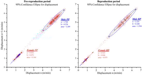 Finally, the average values of the displacement in each of the measurements are graphically represented by means of the Poincare diagram. The two-dimensional 95% confidence ellipse shows that males travel greater distances in both periods, as the ellipses for males are larger than those for females. This indicates that males are more active and cover more ground than females during pre-reproductive periods and reproduction periods (Figure 10).