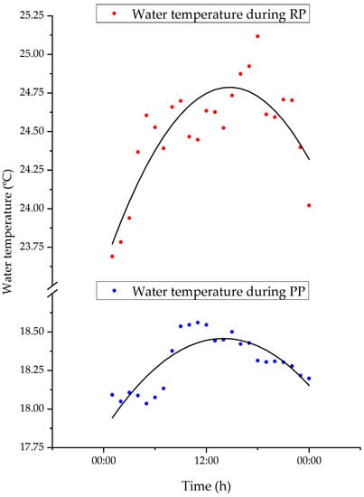Average water temperature recorded every hour for 24 h during PP (bleu dots) and RP (red dots). The black lines represent Chebyshev polynomial fit.