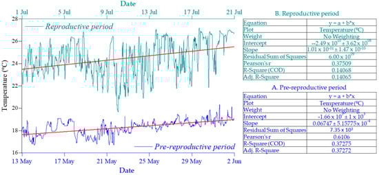 The water temperature was compared in successive days during two different periods (Figure 12): PP (from 13 May to 2 June) and RP (from 1 July to 21 July). The correlation coefficient of 0.61 during PP indicates a moderately strong positive correlation between water temperature and successive days of recording during that time period. On the other hand, the correlation coefficient of 0.37 during RP indicates a weaker positive correlation during that time period.