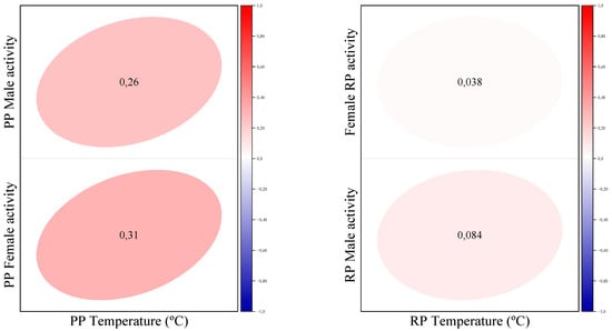 The existence of both light and temperature entrainable oscillators that are weakly coupled refers to the presence of two separate biological rhythms, one influenced by light and the other influenced by temperature, which interact with each other to a limited extent [11]. In razorfish, the Pearson correlation coefficient between water temperature and activity shows a positive but weak correlation in both sexes during PP and an even weaker correlation during RP. For many aquatic poikilothermic animals, such as fish, light is a crucial factor that can influence their behavior, reproduction, and development [31]. Light can affect the timing of daily activities, such as feeding and spawning, as well as the migration patterns of certain species. Additionally, light is necessary for the development of pigments that provide camouflage and other forms of visual communication [31]. Overall, while temperature and light are important factors for both terrestrial and aquatic poikilothermic animals, the specific importance of each factor may vary, depending on the species and its environment.
