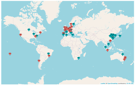 The previous extensive literature reviews [2,3] provided us with a global dataset (see map of the studies’ global distribution in Figure 1), which consisted of 82 selected papers accounting for a total of 1473 (k = 1473) case studies. The dataset included almost one thousand case studies (k = 831) for benthic organisms and 642 case studies for fish (details of the included studies, i.e., the number of case studies and associated variables, are reported in Table S2, Supplementary Materials).