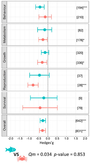 To measure the magnitude of the effect size on individual response variables and to minimize the large heterogeneity of the dataset, we used behaviour, metabolism, growth, reproduction, and survival as the five response categories (Table S1). Therefore, we ran a model to estimate the overall effect size and 95% CI per category.