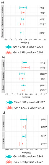 Results of subgroup analysis with mixed effect model for (a) habitat, (b) life stage, and (c) trophic levels of aquatic organisms. Circles and horizontal lines represent Hedges’ g value and 95% CI for each effect size, respectively; number of case studies (k) specified in brackets. Icons reports Qm = omnibus test of moderators from the model. Levels of statistical significance: p ≤ 0.001 ***, p ≤ 0.01 **, p ≤ 0.05 *. Mixed-effects model was performed using the rma.mv function of the metaphor package in R, including study ID and functional trait as a random factor.
