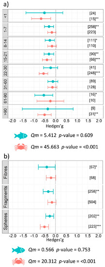 The analysis conducted on the components of the experimental design, specifically experiment duration, revealed that exposure to microplastics in a temporal range between 1 and 90 days resulted in a negative impact with differences between the fish and benthos. A significant negative effect was observed for short durations (less than one day) of exposure to microplastics (g = −0.67 ± 0.45, p = 0.003) for benthic organisms. When the experiment was longer than 22 days and up to 30 days, the effect size in experiments involving benthos was significant (g = −0.56 ± 0.20, p < 0.001). The same pattern was found for fish when they were exposed to microplastics in experiments ranging between 1 and 7 days of exposure (g = −0.31 ± 0.21, p = 0.005) and between 61 and 90 days (g = −0.55 ± 0.42, p = 0.010) (Figure 4a). The smallest microplastic size class (i.e., <25 µm) significantly affected both categories of organisms as follows: g = −0.44 ± 0.19, p < 0.001 for benthos, and g = −0.36 ± 0.22, p = 0.001 for fish. Significant results were also obtained for size class: 25–100 µm (g = −0.26 ± 0.26, p = 0.054) for fish, and size class 100–500 µm (g = −0.27 ± 0.23, p = 0.019) for benthos (Figure 5b). Subgroup analysis investigating the shape of polymers showed that spheres (g = −0.52 ± 0.20, p < 0.001) and fragments (g = −0.34 ± 0.24, p = 0.005) represented a major issue for benthos and fish, respectively (Figure 4b). No significant differences were detected between the groups of microplastic type for fish (Qm = 6.40, p = 0.603) or benthos (Qm = 6.00, p = 0.740); however, our results demonstrate a negative impact from the commonly used polyethylene (PE) and polystyrene (PS) microplastics on aquatic organisms (Figure 5a details the estimates for each type of microplastic used). Finally, the subgroup analysis conducted on the experimental conditions revealed significant differences between groups of microplastic shape (Qm = 20.31, p <0.001), days of exposure to microplastics (Qm = 45.66, p < 0.001), and size (Qm = 18.48, p = 0.001) for benthic organisms, while no differences among groups were found for fish (Table 2).