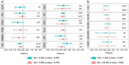 Results of subgroup analysis with mixed effect model for (a) type, and (b) size (µm) of microplastics used in the experiments. Circles and horizontal lines represent Hedges’ g value and 95% CI for effect size, respectively; number of case studies (k) specified in brackets. Icons report Qm = omnibus test of moderators from the model. Levels of statistical significance: p ≤ 0.001 ***, p ≤ 0.01 **, p ≤ 0.05 *. Mixed-effects model, using the rma.mv function of the metaphor package in R, including study ID and functional trait as a random factor.