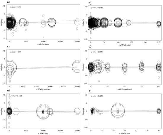 Results of the meta-regressions did not reveal any negative effects on the functional traits of aquatic organisms related to the concentration of microplastics, except when looking at the number of microplastics per litre of water at the highest concentration (p = 0.010). When removing this case study, no significant effects were detected (p = 0.146). Looking at the concentration expressed in milligrams of microplastics per litre, results show a significant but positive correlation (p = 0.033), meaning the effect size increases with concentration and therefore leads to a not-negative effect on functional traits. The model also returned highly significant results with a positive correlation (p < 0.001) for the number of microplastics per kilogram of sediment but there was no significant result for grams of microplastic in kilograms of the same medium (p = 0.683). Concerning microplastics administrated with food, results are not significant for both concentrations expressed as the number of microplastics per kg (p = 0.272) and grams of microplastics per gram (p = 0.482) of food (Figure 6).