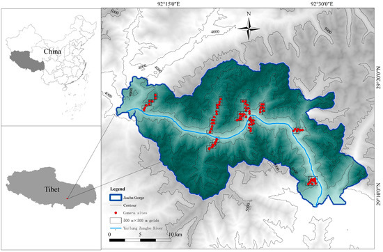The study area is located in Jiacha Gorge, within the Yarlung Zangbo River basin of the Qinghai-Tibet Plateau. Jiacha Gorge is the second largest gorge carved by the Yarlung Zangbo River basin, accounting for 2.6% of the river’s total length [28]. The region has a large elevation drop (ranging from 3200 to 6000 m), with an average altitude of over 4000 m, average annual temperature of 8 °C, an extreme low temperature of −18.6 °C, and the annual average precipitation is 400 mm. The majority of precipitation occurs mainly from May to September due to the influence of the plateau temperate monsoon semi-humid climate [28,29,30]. The local vegetation is representative of the montane ecosystems of China, with vertical zonation as follows: mid-mountain evergreen/semi-evergreen broadleaf forest, subalpine evergreen coniferous forest, alpine shrub meadow and alti-frigetic subnival vegetation [31]. The vegetation type and vegetation cover of alpine shrub meadow may be affected by human factors such as grazing [32]. According to prior research and the existing literature, the Yarlung Zangbo River basin is located at the confluence of the Palaearctic and Oriental faunal regions, which contain many protected animals, including predators of white-lipped deer such as Leopards (Panthera uncia), Dholes (Cuon alpinus), Wolves (Canis lupus), Brown Bears (Ursus arctos), and competitors such as Alpine musk deer (Moschus chrysogaster), Chinese Serow (Capricornis milneedwardsii), and Himalayan serow (Capricornis thar) [33].