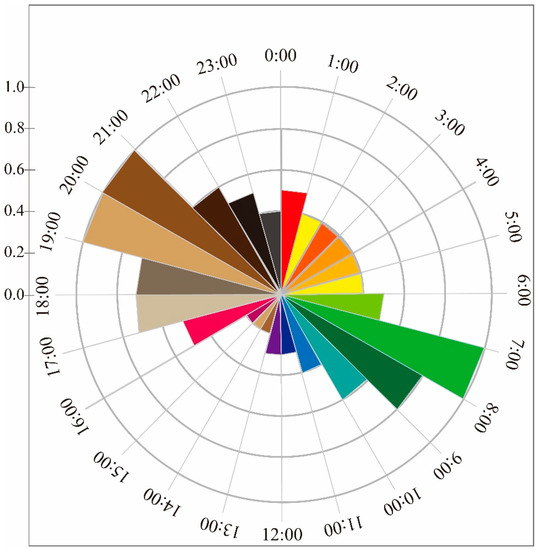 where Tij represents the number of effective photos of animals in class i (i = 1) during the time period (j = 0:00–0:59, 1:00–1:59… or January...December) and Ni represents the total number of individually valid photos of the ith animal (i = 1) [41,42]. Based on the calculation results, circular histograms of daily activity rhythm and annual activity rhythm were constructed. Independent sample t-tests were performed to assess the difference in ITRA between the peak and off-peak periods of daily activity rhythm. A paired sample t-test was used to conducted the difference in ITRA of daily activities among different seasons.