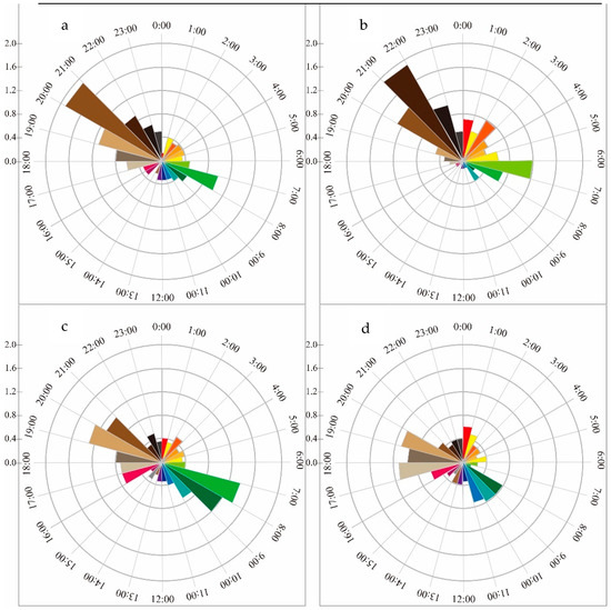 Daily activity rhythms of Cervus albirostris in different seasons. (a) spring, (b) summer, (c) autumn, (d) winter. The vertical coordinates are ITRA × 100,000.