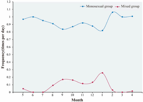 The group activity of white-lipped deer can be classified as either same-sex grouping or mixed-sex grouping. The peak period for the observing mixed-sex groups occurred from July to January of the subsequent year, with January being the peak. From February to June, white-lipped deer are more likely to form groups with members of the same sex (Figure 5).