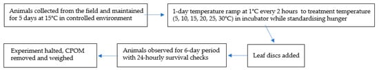 After the starvation period, 15 weighed leaf discs were added to each container. Animals were checked every 24 h and mortality was recorded. Mortality was identified as a lack of pleopod beating and the absence of a reaction to a physical stimulus. These treatments were selected to test outcomes at a range of temperatures up to and beyond known thermal limits. Water levels in each container were maintained, with oxygenated water at the relevant temperature being added if required.