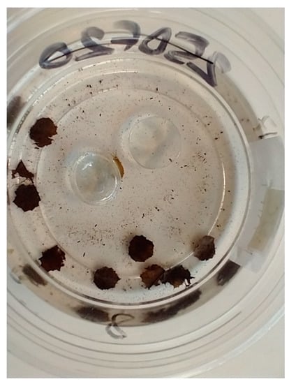 The leaf shredding and survival rates of D. villosus and G. pulex that were either unparasitised or parasitised by E. truttae were measured at a range of temperatures. Survival and shredding data were derived from the same experiment, with mortality being recorded if suffered during the shredding experiment. Amphipods were roughly size-matched in order to ensure all were at the same mature life stage to minimise possible differences in the mass-specific thermal sensitivity of metabolic rates []. Animal sizes were representative of mature individuals found at the field sites, with some selection for a size match. Individual amphipods were placed on a paper towel to remove excess water and weighed (unparasitised G. pulex mean mass was 0.050 ± 0.012 g, parasitised G. pulex mean mass was 0.031 ± 0.011 g and D. villosus mean mass was 0.063 ± 0.015 g). Animals were individually placed in transparent, circular plastic containers (diameter of 7 cm and depth of 5 cm) with 250 mL of aged tap water. Two transparent glass beads were placed in the containers to provide a refuge and to prevent excess swimming due to thigmotactic behaviours [,] while still allowing observations (Figure 2). The containers were then placed in incubators at 15 °C with a 12:12 h light/dark cycle and the animals underwent a 24 h starvation period to standardise hunger, during which the temperature was gradually increased or decreased at a rate of 1 °C every 2 h until the desired temperature for the treatment was reached. Temperature treatments were between 5 and 30 °C in 5 °C increments with the following number of replicates for the initial survival experimental data: 5 °C (unparasitised G. pulex n = 16, parasitised G. pulex n = 13 and D. villosus n = 16), 10 °C (unparasitised G. pulex n = 16, parasitised G. pulex n = 14 and D. villosus n = 16), 15 °C (unparasitised G. pulex n = 15, parasitised G. pulex n = 16 and D. villosus n = 16), 20 °C (unparasitised G. pulex n = 16, parasitised G. pulex n = 15 and D. villosus n = 16), 25 °C (unparasitised G. pulex n = 16, parasitised G. pulex n =14 and D. villosus n = 16) and 30 °C (unparasitised G. pulex n = 16, parasitised G. pulex n = 16 and D. villosus n = 16).