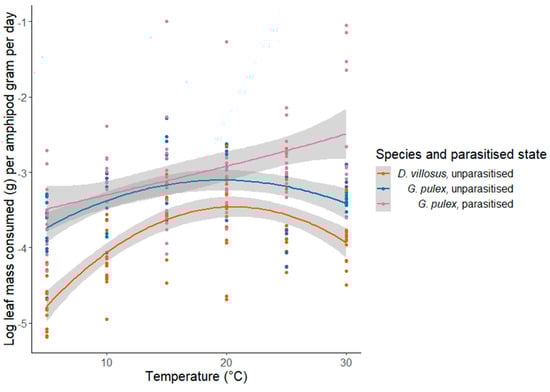Climate change has long been established as a threat to biodiversity due to higher mean temperatures as well as an increase in the frequency and intensity of extreme events [,]. High temperatures experienced during heatwaves can impact on the structure and function of communities [,]. Climate change may also make ecosystems more vulnerable to the impact of additional stressors such as invasive species [,,], which may have different thermal optima than their native analogues. Tolerance to a wide range of conditions is a characteristic of successful invasive species, facilitating establishment and spread; however, survival and behaviour become less predictable at high temperatures [,,]. Experimental work is, therefore, required to investigate how invasive species survive and function in high temperatures in comparison with native analogues. Previous studies comparing shredding rates of G. pulex and D. villosus reported a positive correlation between shredding rates and temperature, but comparisons between the native and invader conflicted [,]. Interactions between parasites and hosts can also be influenced by temperature, with outcomes difficult to predict when the thermal optima of hosts or parasites are exceeded due to species-specific interactions [,,,]. Previous studies have not considered the impact of extreme temperatures and of parasitic infections on shredding efficiency.