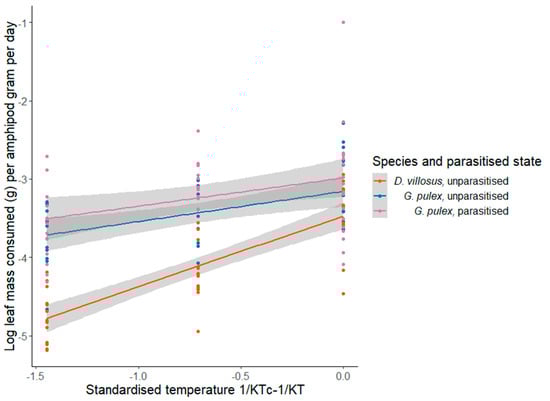 The activation energy of shredding between 5 and 15 °C for unparasitised G. pulex was 0.39 eV (95% CI: 0.17–0.60) and G. pulex parasitised by E. truttae was 0.36 eV (95% CI: 0.09–0.63) (Figure 4). However, the activation energy for D. villosus was higher than predicted by the MTE at 0.90 eV (95% CI: 0.72–1.09) (Table 2) []. The ANCOVA showed a significant difference between amphipod treatments (F(2, 134) = 9.45; p < 0.001), with pairwise Tukey’s post hoc tests finding significant differences between unparasitised G. pulex and D. villosus (t(87) = 2.40; p = 0.05) and between G. pulex parasitised with E. truttae and D. villosus (t(89) = 4.34; p < 0.001), but no difference was detected between unparasitised and parasitised G. pulex (t(87) = 1.90; p = 0.14).