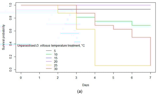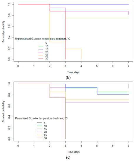 (a) Kaplan Meier plot of survival by temperature treatment of unparasitised Dikerogammarus villosus. (b) Kaplan Meier plot of survival by temperature treatment of unparasitised G. pulex. (c) Kaplan Meier plot of survival by temperature treatment of G. pulex parasitised by E. truttae.