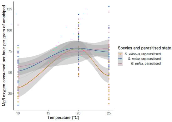 Oxygen consumption for parasitised and unparasitised Gammarus pulex and unparasitised Dikerogammarus villosus at 10, 20 and 25 °C, displaying standard error for Loess-smoothed curves.