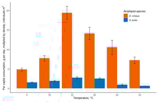 Relative impact potential of Dikerogammarus villosus and Gammarus pulex at different temperatures calculated by multiplying per capita consumption of leaf detritus by amphipod density at field locations. Error bars represent ± 1 standard error.