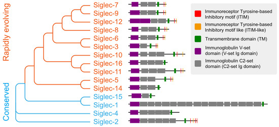 The evolutionary tree and protein structure of human Siglecs. The order of Siglecs is based on sequence similarity and the sequences are displayed according to annotation.