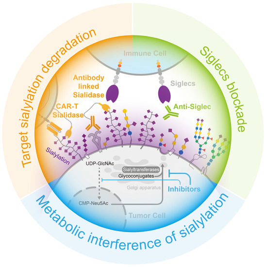 Recent studies have revealed that sialic acid is regarded as a ligand for Siglecs, another group of immune checkpoint proteins. Sialylation–Siglecs interactions enable high tumor sialylation to inhibit the functions of some immune cells, causing immune escape. Therefore, there has been a growing interest in targeting sialic acid for tumor therapy. Sialic-acid-targeting therapies are designed to exploit the high expression of sialic acid on the surface of tumor cells, which can lead to the selective killing of these cells. Several strategies are being explored to target sialic acid, including antibodies, small molecules, and enzyme-mediated approaches [16]. These therapies have the potential to target tumor cells while leaving low-sialylated cells untouched, improving the efficacy of cancer treatments and reducing unwanted side effects.
