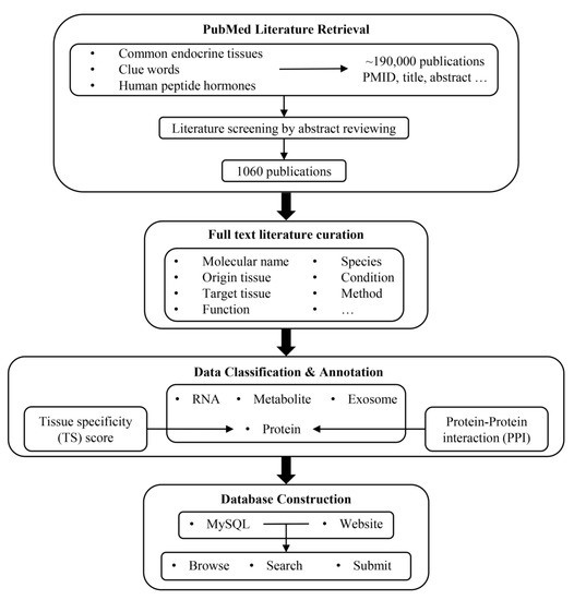 The pipeline for the development of IntiCom-DB is outlined in Figure 1. We first employed two strategies to retrieve ITC-related literature from the PubMed database. The first strategy was to retrieve literature by using single tissues or combining two tissues as keywords, such as “Adipose”, “Liver AND Pituitary”, “Kidney AND Muscle”, etc. The second strategy was to combine words implying inter-tissue interaction relationships, such as “Axis”, “Communication”, “Crosstalk”, and words implying molecules, such as “Protein”, “Peptide”, “Metabolite” and “Exosome” as the keyword combinations for retrieval. The two strategies generated a total of 120 keywords or keyword combinations for retrieval. Through the initial screening by these keywords, a total of 188,728 publications and related information were obtained, including article title, abstract, keywords, etc. The keywords used for retrieval and the number of publications obtained by each group of keywords are shown in Supplementary Table S1. In addition, in order to avoid missing important classical ITC molecules, we retrieved 225 human peptide hormone-related references collected in the HORDB, http://hordb.cpu-bioinfor.org/ (accessed on 9 Jan 2023) human peptide hormone database and screened articles discussing their roles in ITC [43].