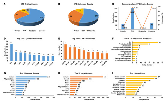 Statistical analysis of the entries in IntiCom-DB. Entry counts of (A) different ITC types, (B) different ITC molecular types, (C) different exosome-related ITC types, (D) top 10 ITC protein molecules, (E) top 10 ITC RNA molecules, (F) top 10 ITC metabolite molecules, (G) top 10 source tissues, (H) top 10 target tissues, and (I) top 10 physiological or pathological conditions related to ITC in IntiCom-DB.
