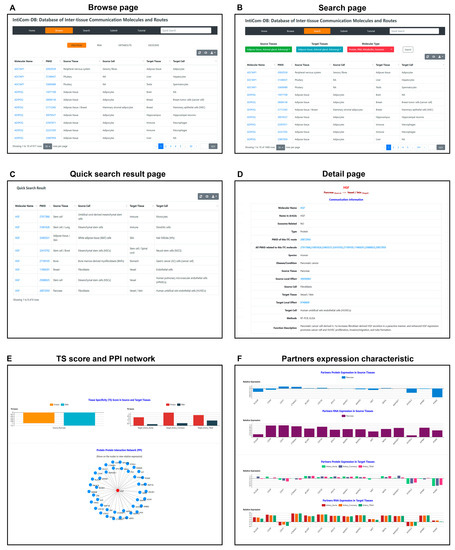 Web interface of IntiCom-DB. (A) Browse page: users can browse corresponding ITC entries after selecting interest molecular types. (B) Search page: users can search interest ITC entries by self-customized combinations of source tissues, target tissues, and molecular types. (C) Quick search result page: a search results specialized designed for showing the ITC entries of interested molecules, which can be accessed by inputting the molecular names (i.e., gene symbols) in the text box in navigator bar. (D) Detail page: basic information of ITC entries, which can be accessed by clicking the corresponding items shown in (A–C). (E) Tissue specificity (TS) scores and protein-protein interaction (PPI) network of ITC protein molecules. (F) Protein and mRNA expression abundances of ITC protein interaction partners in the source and target tissues. (E,F) The subsections of the Detail page on the database web interface.