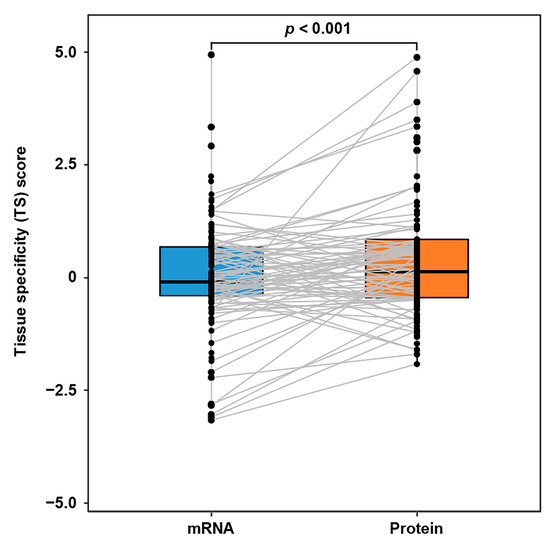 2.2. Proteomic and Transcriptomic Profiles and Tissue Specificity Score Calculation