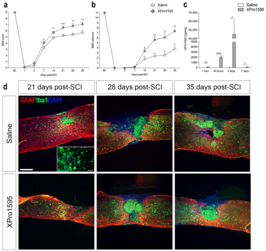 As we previously demonstrated that topical XPro1595 treatment for three consecutive days significantly reduced lesion volumes and improved functional outcomes after SCI in mice [26], we initially wanted to confirm the therapeutic efficacy of XPro1595 in our model. We found BMS scores to be comparable between saline- and XPro1595-treated mice on day 1 and day 3, with XPro1595-treated mice displaying improved hindlimb function from day 7 onwards, compared to saline-treated mice (Figure 1a). BMS subscores improved significantly from day 14 after SCI in XPro1595- compared to saline-treated mice (Figure 1b). We observed no differences between treatment groups in temporal urine content or temporal changes in total body weight (Table S1). Using electrochemiluminescence, we confirmed that XPro1595 successfully reached the injured spinal cord tissue in therapeutically relevant doses, with XPro1595 levels peaking 3 days after SCI, whereafter levels declined (Figure 1c).