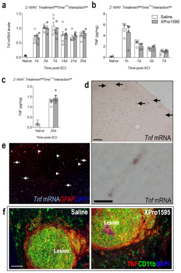 As Tnf is known to act in an autocrine manner both at the transcriptional and protein level [48], we wanted to assess whether XPro1595 treatment influenced the temporal expression levels of Tnf mRNA and TNF protein after SCI. We performed real-time RT-qPCR and electrochemiluminescence analyses. Tnf mRNA (Figure 2a) and TNF protein (Figure 2b,c) levels increased significantly in the lesioned area after SCI, but no differences were observed between treatment groups. TNF levels in sham mice remained low, with no differences between treatment groups (Table S2). Then we also wanted to confirm the cellular and spatial localization of TNF in our model [6]. Using in situ hybridization, we found that by 3 h after SCI, Tnf mRNA+ cells were located primarily in the white matter of the posterior funiculi (arrows top image in Figure 2d, shown for saline-treated mice only), with also a few Tnf mRNA+ cells, presumably neutrophils or macrophages, located inside blood vessels (Figure 2d, bottom image). Most Tnf mRNA+ cells had a glial-like morphology (arrows in Figure 2d,e); these were presumably microglia as they did not co-express the astrocytic marker GFAP (arrowheads in Figure 2e). By 35 days after SCI, TNF co-localized to CD11b+ cells located within the lesion core, just as TNF expression was significantly increased on CD11b− cells surrounding the lesion (Figure 2f).