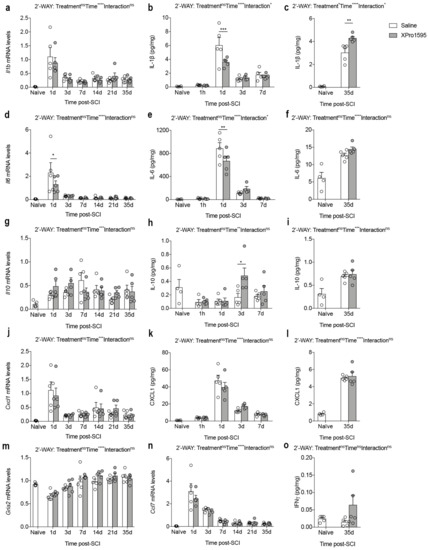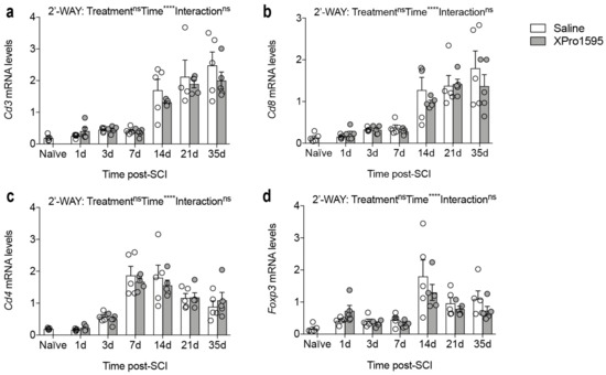 Real-time reverse transcriptase quantitative polymerase chain reaction (real-time RT-qPCR): One centimeter of the spinal cord was collected from mice at 0 (naïve), 1, 3, 7, 14, 21, and 35 days after SCI (n = 5/treatment group), snap-frozen on dry ice, and stored at −80 °C until further processing, as previously described [6].