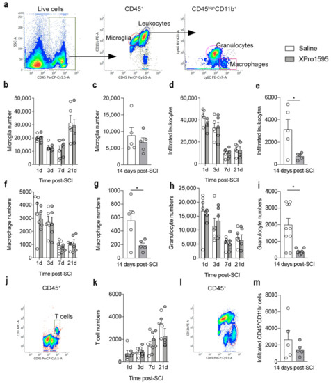 Although the number of microglia changed over time after SCI, we observed no differences between treatment groups (Figure 5b,c). The number of infiltrating leukocytes was highest 1 day after SCI (Figure 5d,e), with no differences between treatment groups (Figure 5e) except for day 14, where we observed a significant reduction in the number of infiltrating leukocytes in XPro1595- compared to saline-treated mice (Figure 5e). By differentiating the analysis further, we observed the same pattern for macrophages (Figure 5f,g) and granulocytes (Figure 5h,i). In the peri-lesion area, XPro1595 treatment transiently increased the number of microglia 14 days after SCI (Figure S2a,b), whereas no differences in the number of infiltrating leukocytes were observed between treatment groups (Figure S2c–h).