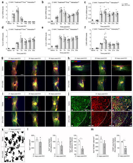We previously demonstrated that XPRo1595 affects Iba1 protein levels in the spinal cord after SCI [26]. Thus, we used immunofluorescent staining to identify the expression pattern and co-localization of CD11b (Figure 6g), Gal3 (Figure 6h), and CD68 (Figure 6i,j) with Iba1+ microglia/macrophages in the delayed phase after SCI. The majority of Iba1+ microglia/macrophages in the lesion core and peri-lesion area co-labeled with CD11b, whereas in more distant areas, Iba1+ cells did not show a strong CD11b immunofluorescent signal (Figure 6g). Gal3 was mainly found on Iba1+ cells located within the lesion core but also in Iba1− cells located in the peri-lesion area (Figure 6h). CD68 was found to preferentially co-localize to Iba1+ cells within the lesion core as well as to Iba1+ cells located in the peri-lesion area (Figure 6i), but to a lesser extent in XPro1595-treated mice (Figure 6j). Based on this observation, we thoroughly characterized the morphology of microglial-like Iba1+ and CD68+ cells in the peri-lesion area (Figure 6k–m). Conversion of high-magnification images to grayscale clearly indicated a difference in microglial activation states between saline- and XPro1595-treated mice 21 days post-SCI (Figure 6k). Although the Iba1+ cell density and area fraction were comparable between treatment groups, this difference was reflected in a significant decrease in Iba1+ cell average size in XPro1595-treated mice (Figure 6l). Finally, the density of Iba1/CD68+ cells was also comparable between treatment groups, but the CD68 area fraction was significantly decreased in XPro1595- compared to saline-treated mice. This indicates XPro1595 treatment after SCI reduces the activation state of CD68+/Iba1+ microglia located in the peri-lesion area.