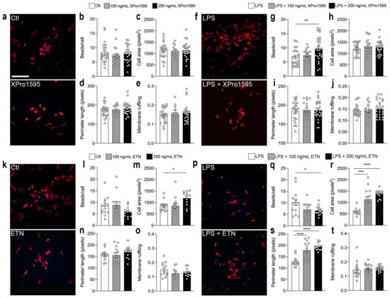 Inhibition of solTNF using either 100 or 200 ng/mL XPro1595 in unstimulated primary microglia (Figure 7a) did not affect the number of engulfed beads per cell (Figure 7b), cell area (Figure 7d), perimeter length (Figure 7d), or membrane ruffling (Figure 7e), as compared to control microglia (Ctl). Following LPS stimulation, however, 200 ng/mL XPro195 (Figure 7f) significantly increased microglial phagocytosis (Figure 7g), without affecting cell area (Figure 7h), perimeter length (Figure 7i), or membrane ruffling (Figure 7j).