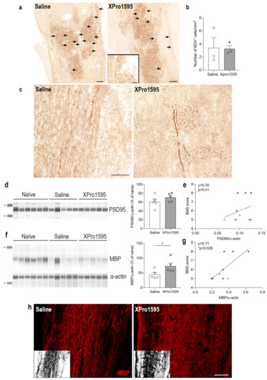 To evaluate spared and/or regenerating corticospinal tract (CST) axons, we injected BDA into the motor cortex 14 days after SCI and investigated anterograde fiber tracing 24 days after SCI. As BDA becomes incorporated by neurons in the motor cortex and is anterogradely transported by axons through the descending corticospinal tract without interruptions, it provides the possibility to estimate the density of spared and/or regenerating axons in the injured spinal cord. By 24 days, we found BDA+ cells located within the lesion core of both saline- and XPro1595-treated mice (Figure 8a). As these cells are presumed to be phagocytic cells and their number in the lesion correlates to corticospinal tract density [45], we estimated the density of these cells. However, we found no differences in the density of BDA+ phagocytic-like cells between the two treatment groups (Figure 8b). We observed no BDA-labeled tract fibers caudal to and within the lesion of either group, possibly due to axonal dieback. BDA-labeled tract fibers were located rostral to the injury with no obvious differences between saline- and XPro1595-treated mice (Figure 8c). These findings were in line with observations of comparable post-synaptic PSD95 levels between saline- (61.00% ± 6.27%) and XPro1595-treated (70.81% ± 4.30%) mice 35 days after SCI (p = 0.23) (Figure 8d) and was reflected by a lack of correlation between PSD95 levels and functional outcome (BMS) (Figure 8e).