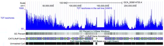 One of the main limiting factors relative to validating the isochore theory was the lack of high-quality DNA sequences. To overcome this problem, we applied Isofinder to the first complete 3.055 billion base pair T2T sequence of a human genome [13]. The obtained isochore and superstructure coordinates were then shared in a public database (https://genome.ucsc.edu/s/oliver/T2T%20human%20isochores (accessed on 20 April 2023)). Using PacBio HiFi and Oxford Nanopore, ultralong-read sequencing gapless assemblies were obtained for all chromosomes (except Y) of the homozygous CHM13hTERT cell line, which corrects errors in the prior references and introduces nearly 200 million base pairs of additional sequences [13]. Table 1 shows the lengths and GC% of T2T human isochores by chromosome, while Table 2 shows a summary statistic. The T2T human isochore map of chromosome 1, obtained with IsoFinder and plotted with the help of the UCSC Genome Browser [56,57], is shown in Figure 1. The online isochore maps for all chromosomes are available at the UCSC Genome Browser: https://genome.ucsc.edu/s/oliver/T2T%20human%20isochores (accessed on 20 April 2023). Note that besides the image of isochore maps for every chromosome, this website provides access to tables with specific genome coordinates for each isochore by using Table Browser (https://genome.ucsc.edu/cgi-bin/hgTables?hgsid=1627501187_vJA8raAFaxmpp4jAbRjEuzBiYujn (accessed on 20 April 2023)). In this way, interested researchers can now use T2T isochore data, as well as the annotations for different genome elements available on this website, to check a specific hypothesis about genome structure.