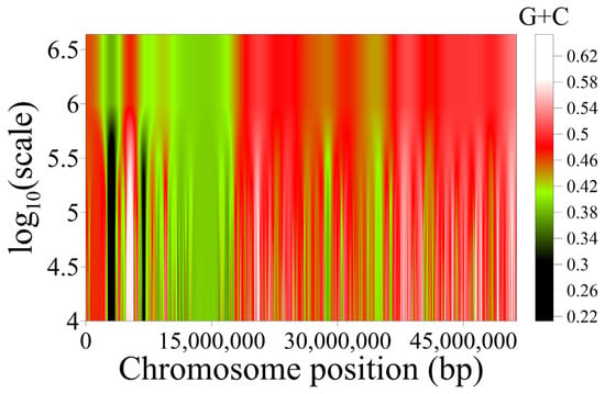 Variation in nucleotide composition along T2T human chromosome 22 at scales between 10 Kbp and 4 Mbp, as revealed by wavelets. The two genome superstructures of this chromosome (green on the left and red on the right) are clearly revealed. The finer-grained isochore structure at lower scales is also discernible.