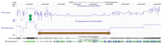 Comparison of isochore and superstructure maps in human T2T chromosome 21 by means of the UCSC Genome Browser. The online image can be observed at the following website: https://genome.ucsc.edu/cgi-bin/hgTracks?db=hub_3267197_GCA_009914755.4&lastVirtModeType=default&lastVirtModeExtraState=&virtModeType=default&virtMode=0&nonVirtPosition=&position=chr21%3A1%2D45090682&hgsid=1583990213_Mq2SxT3AB7CVJP4gui2lAeO3ZljM (accessed on 20 April 2023). The blue lines indicate the GC content of each isochore or superstructure. The orange arrows point to a region of chromosome 21 with low GC content, known as the big ‘gene desert’. The green arrows indicate a region where isochore and superstructure boundaries overlap.