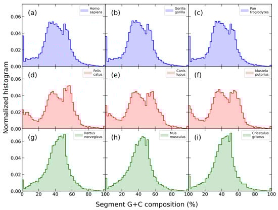 G+C composition histograms of the segments obtained by means of a segmentation algorithm at the s = 0.95 significance level of the complete genomes of three primates: human (a), gorilla (b), and chimpanzee (c); three carnivorous: cat (d), dog (e), and polecat (f); and three rodents: rat (g), mouse (h), and Chinese hamster (i). Note that all histograms in the same row, which correspond to closely related species in terms of evolutionary divergence time (http://www.timetree.org (accessed on 20 April 2023)), look quite similar to each other.