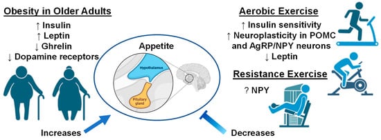 The benefits of aerobic exercise towards brain health and synaptic plasticity are well established in the literature [195,196]. Unsurprisingly, exercise is seen as a powerful tool to combat the prevalence of obesity [195] given that in obese older adults, chronic exercise training can improve insulin sensitivity, reduce inflammation, and improve body composition [197,198]. Indeed, chronic exercise training is postulated to improve energy balance through modulation of neuroplasticity in POMC and AgRP/NPY neurons [199,200]. A recent study in mice provides compelling evidence showing aerobic exercise can increase POMC neuronal excitability, with leptin-dense POMC neurons showing the most robust response to exercise [201]. Intriguingly, in this same study, exercise was reported to inhibit NPY neuronal activity, suggesting that exercise can exert rapid reorganization in multiple neuronal populations within the tuberal hypothalamus [201]. Further, there is limited evidence to suggest POMC mRNA expression is differentially altered following acute and chronic aerobic exercise in not only the hypothalamus, but also the frontal cortex and hippocampus [200]. Together, these lines of evidence suggest aerobic exercise can facilitate neuroplasticity within POMC neurons throughout the brain, and ultimately benefit the efficacy of satiety cues. Moreover, although not specific to the hypothalamus, human data also suggests exercise-related reductions in leptin and high-density lipoprotein, as well as increases in serum brain derived neurotrophic factor (BDNF) which are all related to improved gray and white matter integrity within the brain, suggesting improved exercise-modulated neuroplasticity in obese humans [202]. Moreover, it is also worth noting several independent research groups have found, in animal models, that aerobic exercise can be neuroprotective to obesity-related neuroinflammation within the hypothalamus [203,204], which may ultimately further facilitate the reestablishment of satiety signaling within the brain [205]. Intriguingly, there is evidence to suggest the effects of exercise may differ between sexes. In a recent study, Wilson et. al., (2020) found that in obese mice, only female mice downregulate mRNA expression NPY within the hypothalamus following 12 weeks of aerobic exercise and intermittent fasting [206]. However, it is worth noting that the ways by which exercise may differentially influence POMC and AgRP/NPY systems based on sex is a relatively novel concept that needs to be studied extensively. Lastly, there is limited data to suggest that in obese adults, chronic resistance exercise training may improve circulating biomarkers associated with appetitive behavior such as glucose and NPY, as well as reduce circulating pro-inflammatory markers such as TNF-α and IFN-γ [207,208]. Moreover, while randomized controlled exercise trials in humans are limited in individuals with sarcopenic obesity, a combination of aerobic exercise and resistance training may be the most beneficial [209]. For example, Villareal and colleagues found that in dieting obese older adults at risk of developing sarcopenia, performance in the physical performance test improved more robustly in older adults that performed concurrent exercise training than in aerobic or resistance training alone [210]. Meanwhile, in a smaller study including individuals diagnosed with sarcopenic obesity, concurrent exercise training was found to induce similar improvements in body weight and fat mass, while resistance training alone yielded greater improvements in muscular strength than aerobic or concurrent training [211]. Together, these studies suggest that exercise training routines that incorporate resistance training or a combination of resistance training plus aerobic exercise will improve the clinical outcomes in obese older adults and adults with sarcopenic obesity. However, it is important to highlight here that whether resistance exercise can more directly benefit the neurocircuitry affected in obesity remains understudied in the literature. Indeed, future studies should aim to bridge this knowledge gap from an acute and chronic point of view with an emphasis on neuro-centric biomarkers to better understand whether resistance exercise can serve as an ancillary tool against obesity. Nevertheless, although not fully elucidated, it is possible that exercise may aid in re-establishing a balance in the brain circuitry that regulates hunger and food intake as illustrated in Figure 3. There is ample evidence demonstrating that aerobic and resistance exercise training can be beneficial in older adults, adults with obesity, and older adults with sarcopenic obesity. However, it remains challenging to address in humans the neurobiological mechanisms by which exercise can influence the neurocircuitry behind energy homeostasis and appetitive behavior. Nevertheless, animal studies continue to be crucial in bridging this gap in the literature and provide compelling evidence that exercise can act directly on POMC and AgRP/NPY neurons, as well as by influencing neuroinflammatory mediators such as pro-inflammatory cytokines. Moreover, emerging frameworks suggest there may be sex differences in some of the mechanisms discussed above, yet to what extent remains to be fully elucidated. Future studies would benefit from addressing some of the gaps in the literature highlighted in this section to better characterize the neurobiological responses to obesity, sarcopenic obesity, possible sex differences, and how exercise influences each.