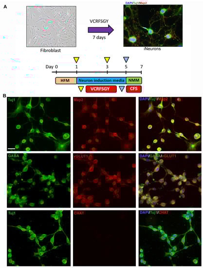 Direct conversion of skin-derived fibroblasts into induced neurons (iNs): (A) Schematic of the direct conversion protocol. Neurons (iNs) were generated in 7 days using seven small molecules: VPA, CHIR99021, Repsox, Forskolin, SP600125, GO6983 and Y-27632. (B) Fluorescent microscope imaging at 20× magnification shows directly converted iNs from a healthy line. iNs were checked for expression of pan-neuronal markers such as Tuj1 (green) and Map2 (red) (top row), as well as inhibitory neuronal marker GABA (green) and glutamatergic neuronal marker vGLUT1 (red) (middle row). The neuronal mixed population does not contain cholinergic neurons (lower row). Scale bar = 100 µm. HFM: human fibroblast medium, NMM: neuron maturation medium.