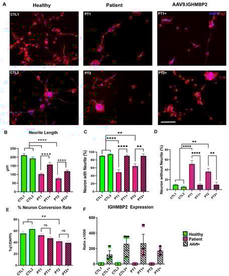 We compared the neuronal phenotype of the iNs of patients with IGHMBP2 mutations to the controls, and the effects of treatment with AAV9.IGHMBP2. Tuj1+ staining of the iNs demonstrated that the SMARD1/CMT2S patient lines also had altered neuronal morphology compared to the healthy iNs, which was restored upon treatment with AAV9.IGHMBP2 (Figure 3A). Further analysis indicates that the SMARD1/CMT2S lines had significantly shorter neurite lengths (Figure 3B) and a lower number of neurites per tuj1+ soma (Figure 3C), and subsequently, a higher percentage of Tuj1+ neurons without neurites (Figure 3D,E) compared to the controls. Importantly, treatment with AAV9.IGHMBP2 improved all the phenotypes in both lines (Figure 3A–E).