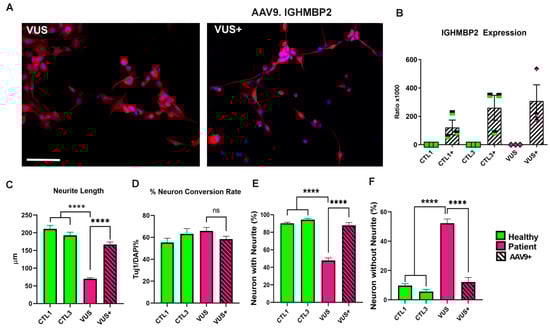 We further determined whether the observed effect can be rescued via treatment with AAV9.IGHMBP2 in the VUS iNs. Surprisingly, the treated VUS iNs showed a significant rescue of all the neuronal morphology parameters, as well as the neuron conversion rate, following a similar pattern to that observed in earlier confirmed IGHMBP2 iNs (as shown in Figure 3). These results suggest that the VUS may be pathogenic and can contribute to the observed phenotype. Moreover, this is the first study reporting the neuronal phenotype of a VUS in IGHMBP2-related disorders and its rescue with AAV9-mediated IGHMBP2 expression.