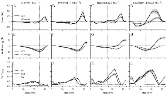 Mechanical power (A–D) and work (E–H) of the AT force at the ankle joint (ATF power/work), as well as Achilles tendon power (AT power) and elastic strain energy storage and recoil (AT energy). Negative values in the mechanical power indicate energy absorption at the ankle joint during dorsiflexion and AT elastic strain energy storage. Positive power values indicate energy production at the ankle joint during the plantar flexion and elastic AT strain energy recoil. Panel (I–L) show the electromyographic activity of the soleus (Sol), gastrocnemius medialis (GM), and tibialis anterior (TA) muscles normalized to a maximum voluntary contraction (EMGnorm). All investigated parameters are presented for the stance phase of walking at slow (0.7 m.s), preferred (1.4 m.s), transition (2.0 m.s), and maximum speed (2.6 ± 0.3 m.s) as mean ± standard error (average of fifteen participants with nine gait cycles). The vertical dashed line shows the separation between dorsiflexion and plantar flexion.