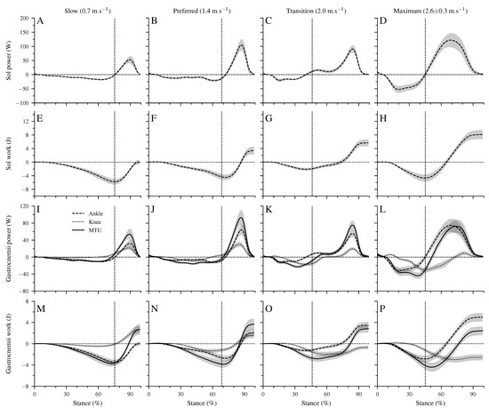 Mechanical power (A–D) and work (E–H) of the soleus (Sol) muscle at the ankle joint, mechanical power (I–L) and work (M–P) of the gastrocnemii muscles at the ankle and knee joints, and the mechanical power/work of the gastrocnemii muscle-tendon unit (MTU). Negative values in the mechanical power indicate energy absorption at the ankle joint during dorsiflexion, energy absorption at the knee joint during knee extension, and energy absorption of the MTU during lengthening. Positive power values indicate energy production during ankle plantar flexion, knee flexion, and MTU shortening. All investigated parameters are presented for the stance phase of walking at slow (0.7 m.s), preferred (1.4 m.s), transition (2.0 m.s), and maximum speed (2.6 ± 0.3 m.s) as mean ± standard error (average of fifteen participants with nine gait cycles). The vertical dashed line shows the separation between dorsiflexion and plantar flexion.