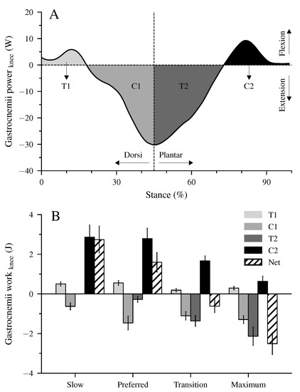 Mechanical power (A) and work (B) of the biarticular gastrocnemii muscles at the knee joint illustrate the transfer (T) and joint-coupling mechanisms (C). T1: ankle-to-knee joint energy transfer, C1: energy absorption at the knee joint during dorsiflexion and knee extension, T2: knee-to-ankle joint energy transfer, C2: energy production at the knee joint during plantar flexion and knee flexion, Net: net work at the knee joint. The values are mean ± standard error (average of fifteen participants with nine gait cycles).