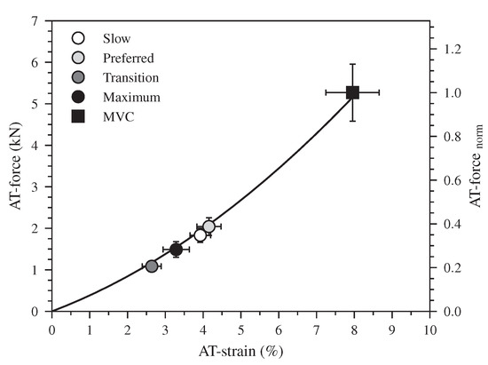 The force-strain relationship of the Achilles tendon (AT) during a maximum voluntary contraction (MVC). The markers show the operating AT force and strain values at the beginning of the plantar flexion during walking at slow (0.7 m.s), preferred (1.4 m.s), transition (2.0 m.s) and maximum speed (2.6 ± 0.3 m.s, Max) as means ± standard error (average of fifteen participants with nine gait cycles).