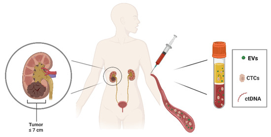 Peripheral blood collection in RCC patients. Liquid biopsy, in particular peripheral blood, can be a source of cancer material: circulating tumor cells (CTCs), circulating tumor DNA (ctDNA), and extracellular vesicles (EVs), released by tumors into the bloodstream. Figure was generated with BioRender.